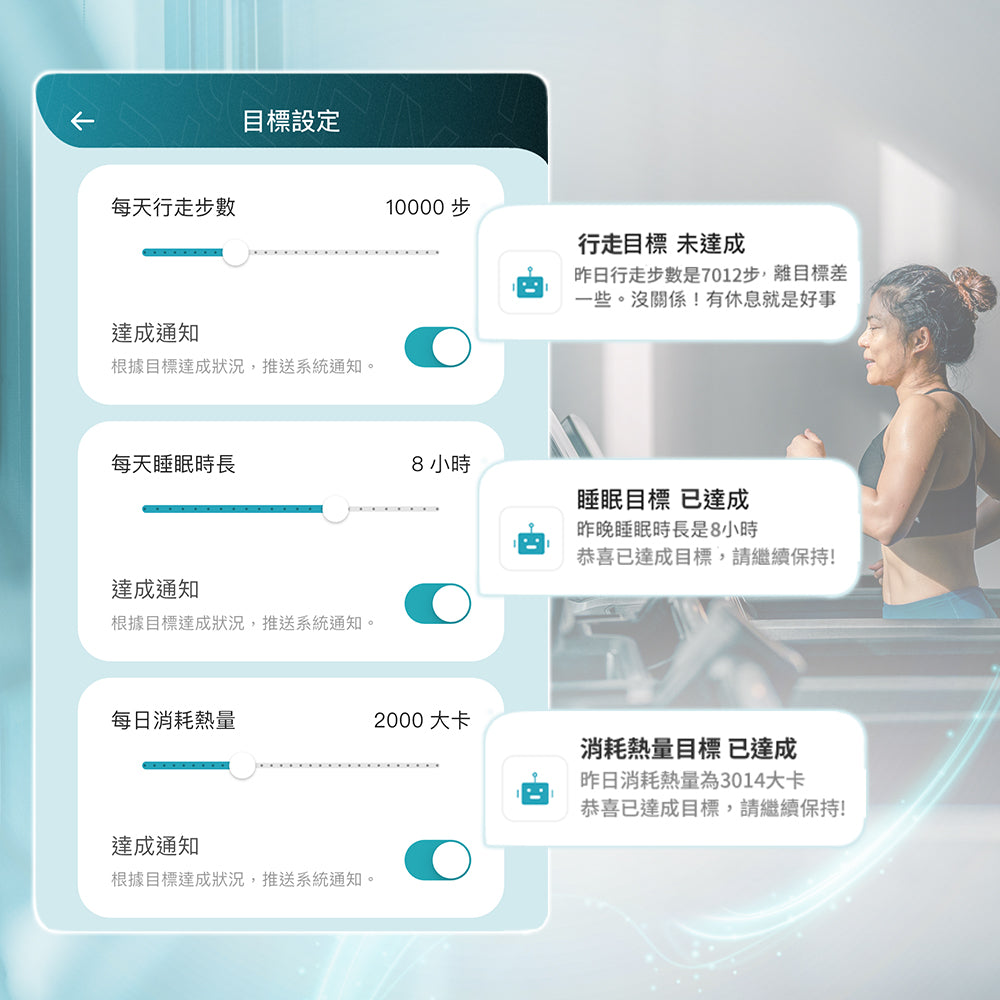 以目標為核心追蹤行走、睡眠、熱量、距離四大指標;達成門檻可彈性調整。達標當下立即推播通知。