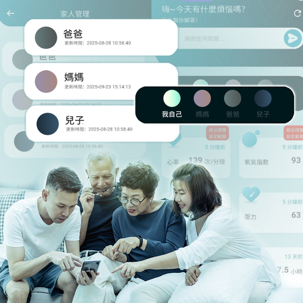 支援多位家人加入,長輩與孩童各種指標即時掌握,App有指標異常即時通知,讓你遠端也能放心。