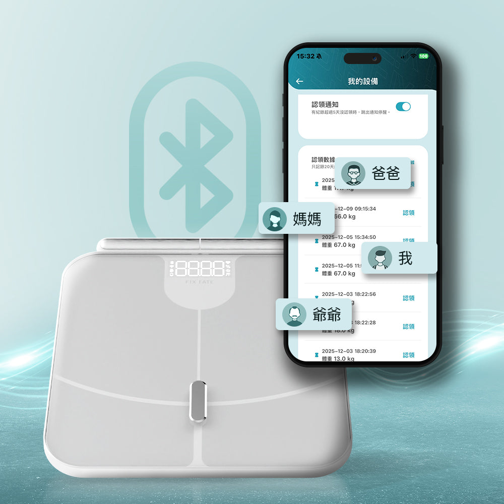 體脂秤支援多人使用,您可為家中成員新增獨立檢測用戶,分別紀錄個人數據;也能讓多台手機透過藍牙連接同一台體脂秤,不互相干擾。