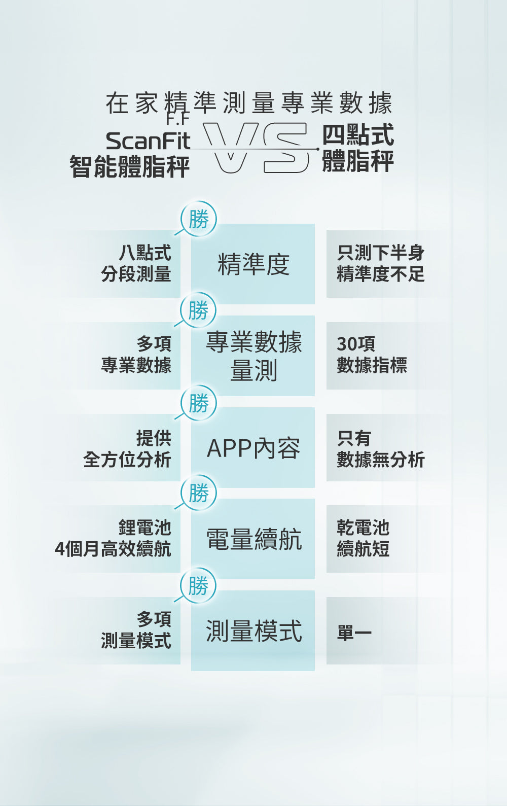 有別於一般腳踩四點式體脂計,八點式利用電極傳導,上下身分段式測量,僅需30秒立刻量出全身精準數據。